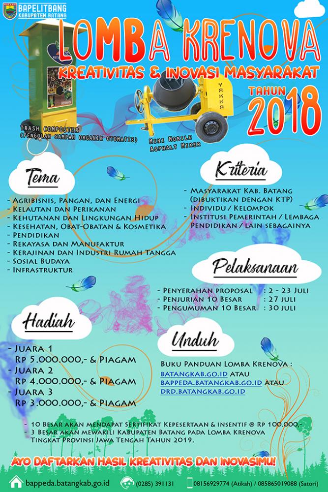 Lomba Krenova (Kreativitas dan Inovasi Masyarakat) Tingkat Kabupaten Batang Tahun 2018 telah dibuka. Pendaftaran/Penyerahan Proposal mulai 2-23 Juli 2018 di Bapelitbang, Jl. RA. Kartini No. 1 Batang.Tahun ini, Juara 1 akan mendapatkan uang senilai Rp 5.000.000,00 + Piagam Penghargaan, Juara 2 senilai Rp 4.000.000,00 + Piagam Penghargaan, dan Juara 3 senilai Rp 3.000.000,00 + Piagam Penghargaan. Selain 3 Juara/Pemenang, 10 Besar Nominasi juga akan mendapatkan insentif senilai @Rp 100.000,00 (seratus ribu rupiah).