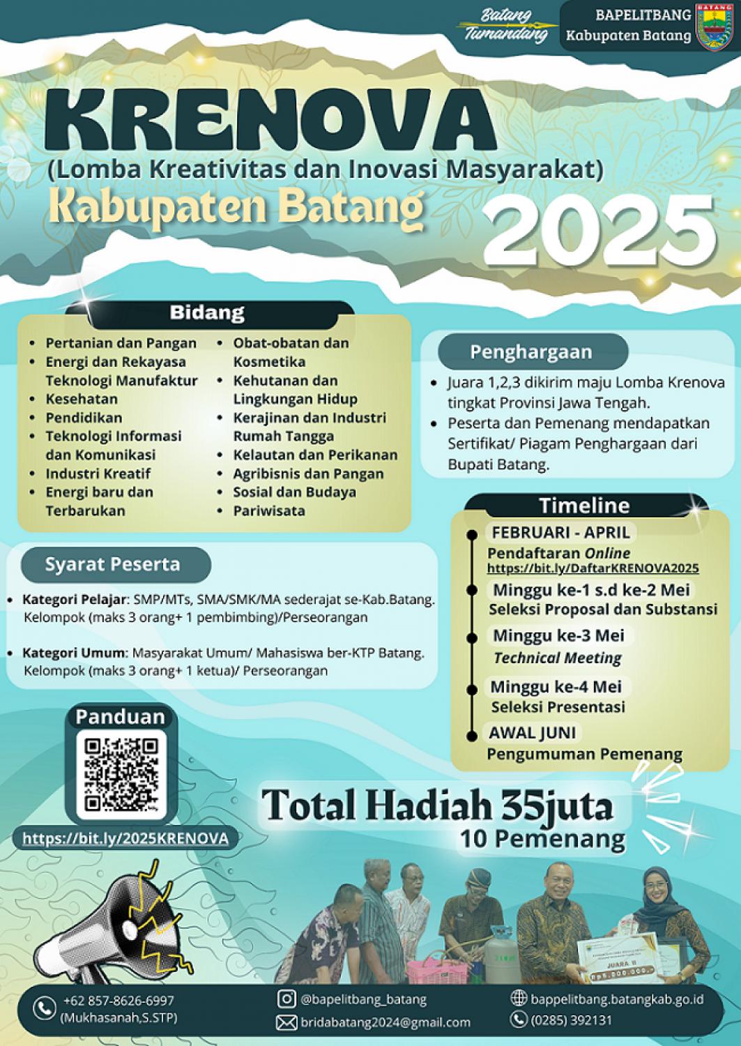Dalam rangka mendorong Ekosistem Kreativitas Dan Inovasi Masyarakat di Kabupaten Batang yang dapat memberikan manfaat bagi pembangunan daerah, Pemerintah Kabupaten Batang melalui Badan Perencanan, Penelitian dan Pengembangan Kabupaten Batang menyelenggarakan Lomba Kreativitas dan Inovasi Masyarakat (KRENOVA) Tahun 2025. Sehubungan dengan hal tersebut, denganhormat kami sampaikan beberapa hal sebagai berikut: